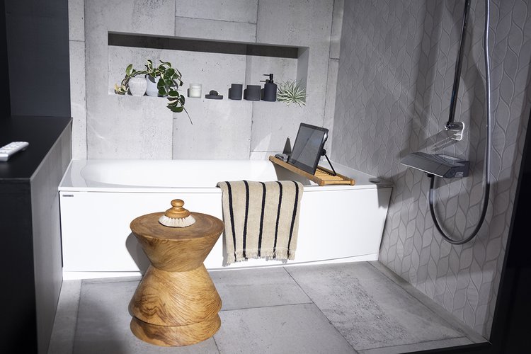 加えてMAKO氏は、レイアウトフリーテレビを置いた書斎とプライベートビエラを置いた浴室も担当。書斎は「内装材と限られたアイテムだけでもインテリアを楽しめることを表現」、浴室は「棚に好きな小物やお気に入りのソープを置いたり、好きなスツールを置くなどして、プライベートビエラでお風呂時間を楽しく過ごせるコーディネートにした」とのこと。