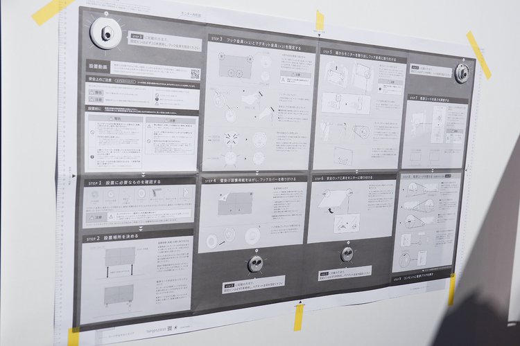 専用金具は上側用のフックと下側用のマグネットを各2個ずつ用意。製品には紙の設置用ガイドが付属しており、専用業者を呼んだり壁にネジ穴を開けずとも設置ができるとアピール。なお、設置用のピンは跡が目立ちにくく、賃貸物件でも大きな影響はないのではとしながら「契約条項にもよると思うのでお客様の方でも確認をしていただきたい」と述べていた。