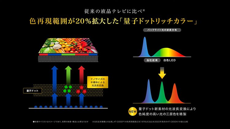 色表現能力は、前モデルより量子ドット素材を刷新した「量子ドットリッチカラー」を導入。量子ドットを用いて光波長変化を行うことで、通常のLED光源よりも純度の高い三原色を生成。従来の同社液晶テレビと比較して、色再現範囲は約20%向上する。