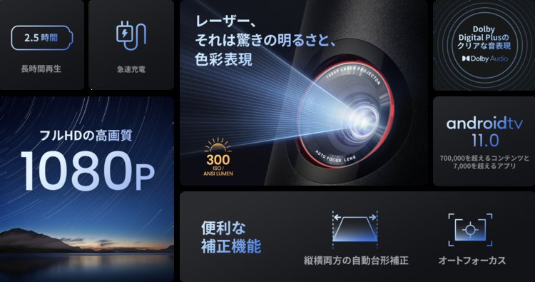 搭載OSはAndroid TV9.0から、Android TV11.0へとアップデート。モバイルプロジェクターでは世界初の搭載になるとのこと。これに伴い対応アプリも3,600以上から7,000以上に拡大。1台で多彩なエンターテイメントを楽しめる。
