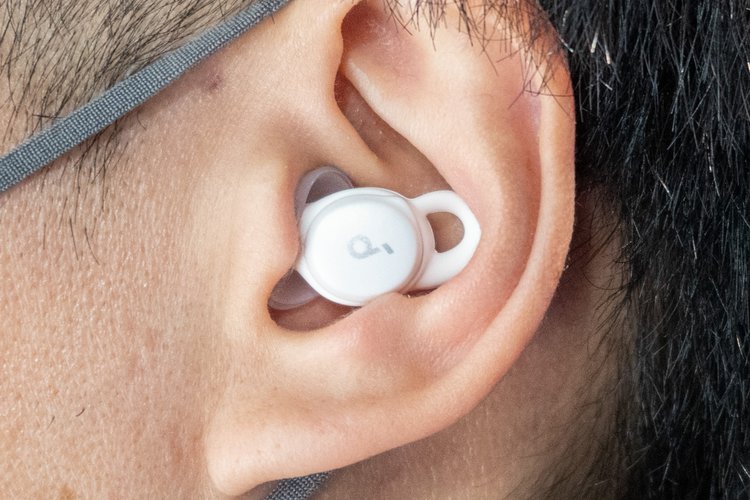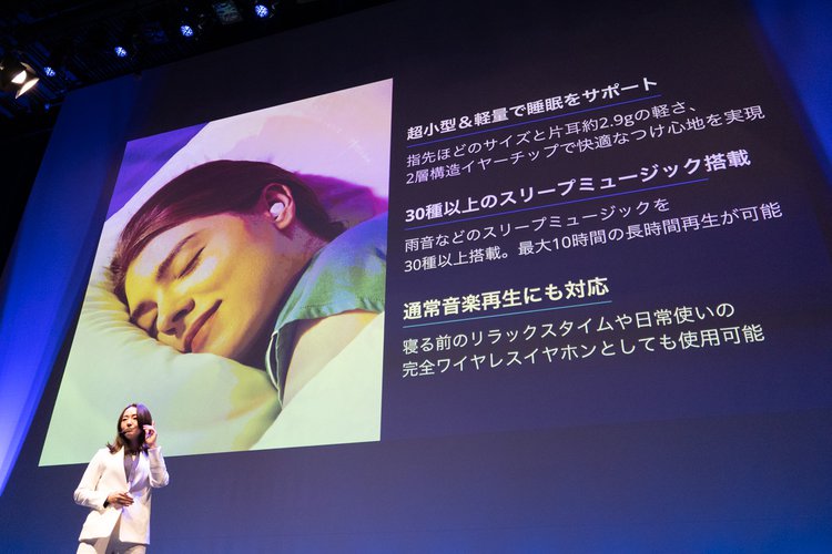 小さく軽量なデザインにより、睡眠時の使用を想定した完全ワイヤレスイヤホン。質量は片耳約2.9gとなり、耳に負担をかけにくいサイズと、横になっても枕と耳の間で干渉しにくいように配慮している。