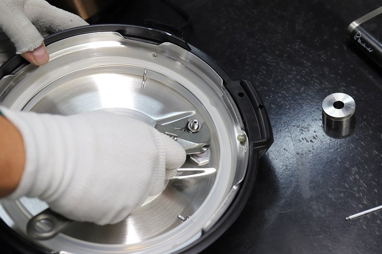 検査は手順書に沿ってひとつひとつ確認していく。サイズ・外観の確認、ネジは1本1本を締め直し、パッキンの傷、フィルターの装着強度、内釜のバリの変形なども確認され、実際にひとつひとつ圧力をかけて安全性を確認する。