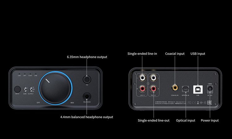 デジタル入力端子はUSB Type-B×1、RCA同軸×1、TOS光×1、アナログ入出力にはRCA、ヘッドホン出力端子には4.4mmバランス×1、6.35mmシングルエンド×1を装備する。