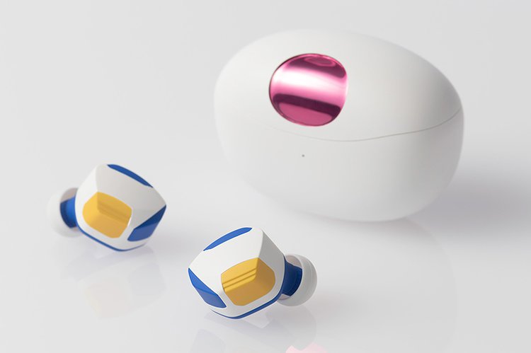 イヤホン本体は同キャラをイメージしたホワイト×パープルの2トーン仕上げを採用。充電ケースは、「それまでの形態の圧倒的な力を小さな身体に集約された」とする第四形態をモチーフにデザインされている。