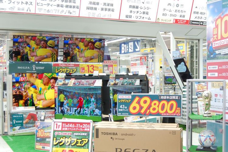 FIFAワールドカップが開幕、ドイツを撃破した日本の勝利に大きな盛り上がりを見せている。臨場感あふれる試合観戦が楽しめる大画面・高画質テレビにも注目が集まるなか、ビックカメラ池袋本店の店頭はワールドカップ一色。行動制限が緩和されたことで、家電量販店にも客足が戻りつつある。