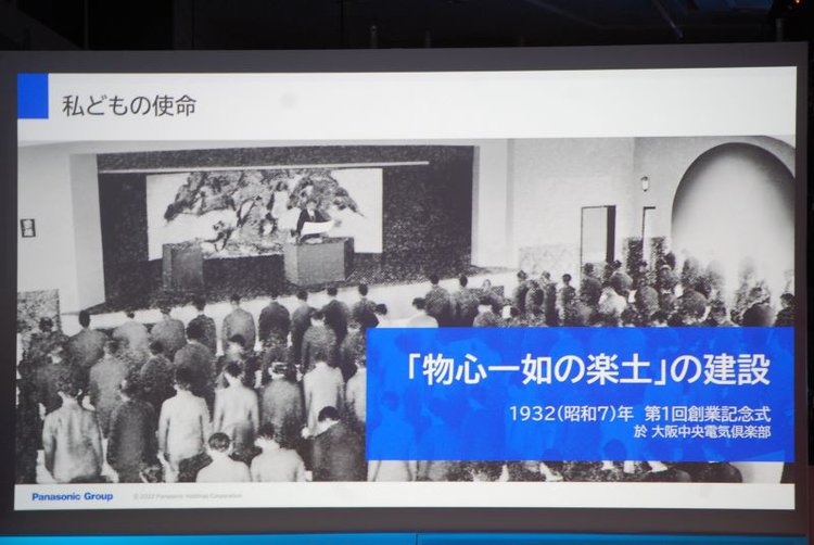 目指す姿は「人生の幸福が安定する状態を持続する楽土を築くことが松下電器の真使命。後に『物心一如の繁栄』という言葉で、幸之助創業者が生涯を通じて私どもの目指すところとして示してこられました」と1932年の第1回創業記念式にさかのぼる。「物心一如の繁栄を実現すべく、創業以来、その時代その時代の社会課題の解決のため、また、人々の幸せのために事業を通じたお役立ちを果たして参りました。人々のより豊かな暮らしを実現すべく、本日ご臨席をたまわりました皆様と共に、共存共栄の道をたどって参りました」と力を込めた。