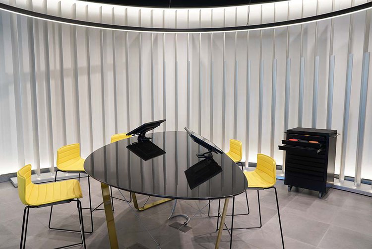 ブランドを伝える空間としてデザインされたというショールーム内は、車にだけ意識が向けられるように余計な装飾を排除。ドライバー同士が直接会話できるフォーラムとしての空間づくりも目指し、商談机も設置していない。