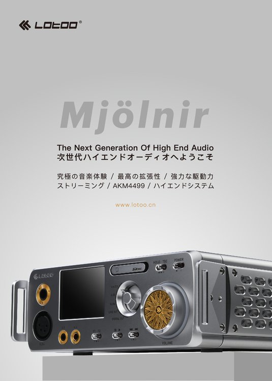 Mjolnirは、Lotooが長年の開発期間をかけ、満を持して発表するという据え置き型スタンドアローンタイプのハイエンドDAP。現在は最終調整中なため詳細な仕様、発売日、価格は未定とのことだが、「AKM4499搭載」「豊富な入出力」「Wi-Fi搭載によりストリーミング対応」などの特徴を備えるという。