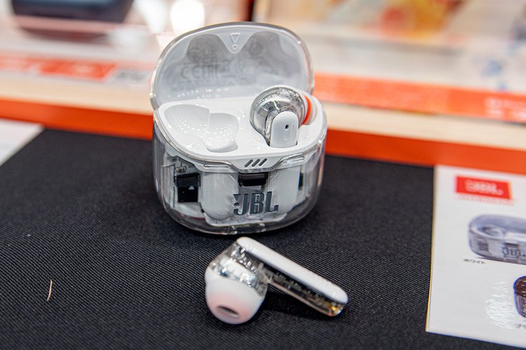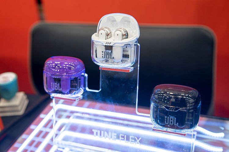 スケルトンカラーが目を惹くTUNE FLEXは、ホワイト、ブラックに加え、同社直販限定アイテムのパープルを含めた全3カラーを展示。ブーススタッフによると、JBLの完全ワイヤレスイヤホンはブラックが売れる傾向にあるというが、本モデルは「男女問わずホワイトモデルが一番売れている」とのこと。