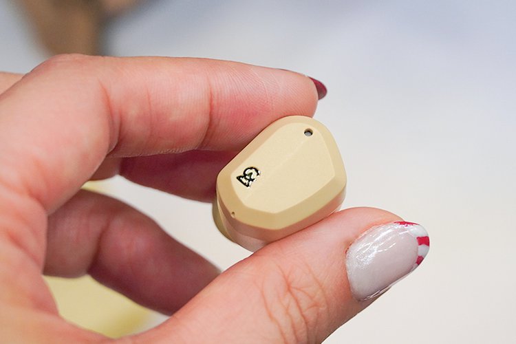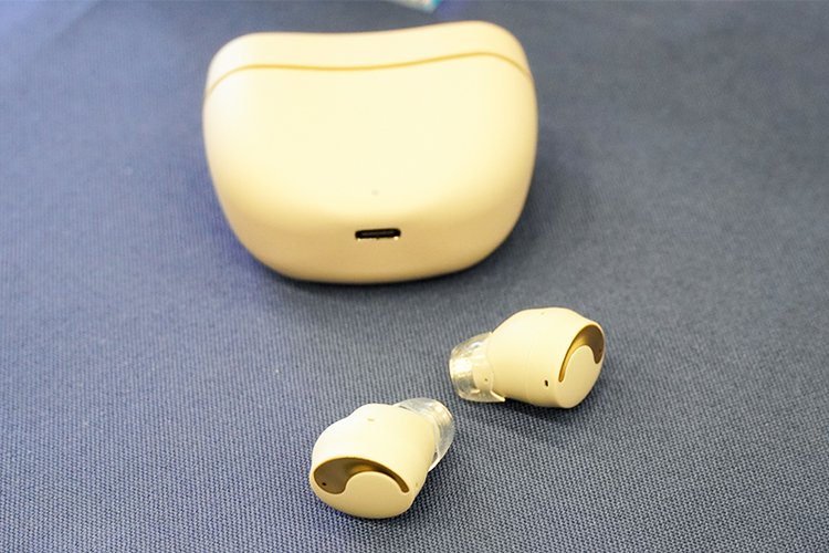 以前にイベントに参考出品された際から外観がアップデート。アクセントになっているゴールドカラーの部分が、艶感のあるものからマット仕上げに変更されている。イヤーピースもオリジナル品で、骨伝導ドライバーの搭載によりイヤホンを耳に密着させる必要があることから、新規に開発したという。傘部分のスカラップデザインが特徴的だ。