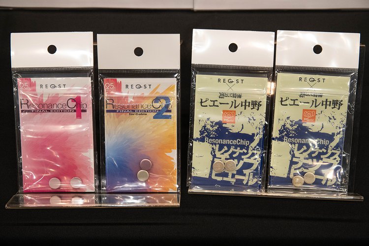 「R-Pad2」は同社独自の焼物を革製パッドに封入したアイテムで、オーディオ機器の上などに「置くだけ」で効果があるというアクセサリー。「ADP-360RR」はイヤホンケーブルなどに「挟み込む」形で利用するアダプター。さらに、「貼るだけ」で音が良くなるということで話題の「レゾナンスチップ」も最終バージョンを用意しており、会場で実際に体験できるようになっていた。
