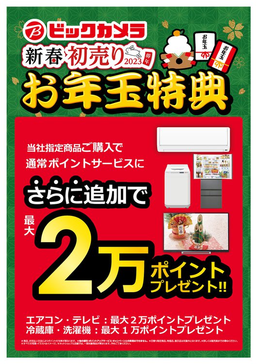 さらに、ビックカメラ各店、ビックカメラ・ドットコムでは、2023年1月1日(日)〜1月9日(月)の間、指定のエアコン、テレビを購入した場合に通常ポイント基本10%サービスからさらに最大20,000ポイント、指定の冷蔵庫、洗濯機を購入の場合には最大10,000ポイントプレゼントなどの「お年玉特典」を実施する。