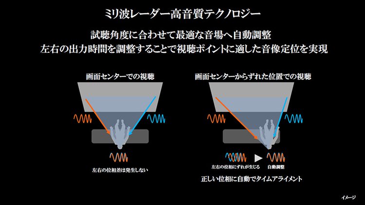 ミリ波レーダーセンシングシステムでは、前述のように視聴位置を把握し画質と音質を自動調整。精細感とノイズ抑制のバランスを最適化する「ミリ波レーダー高画質テクノロジー」と、テレビ画面とユーザーの視聴位置との角度に合わせて左右の出力時間を調整することで視聴ポイントに適した音像定位を実現する「ミリ波レーダー高音質テクノロジー」を実装した。