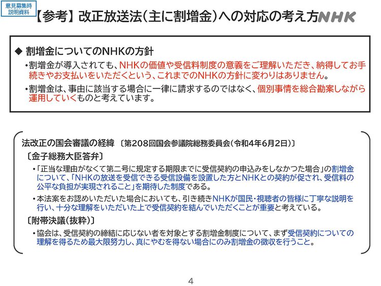 本変更案は、昨年12月6日に開催した経営委員会で議決されたもの。これまでは「遅滞なく」としていた放送受信契約書の提出を、「受信機の設置の月の翌々月の末日まで」とする申込期限の改定や、令和5年3月以前に「不正な手段により放送受信料の支払いを免れたとき」は、受信料に加えてその2倍に相当する額を割増金として請求できるようになった。