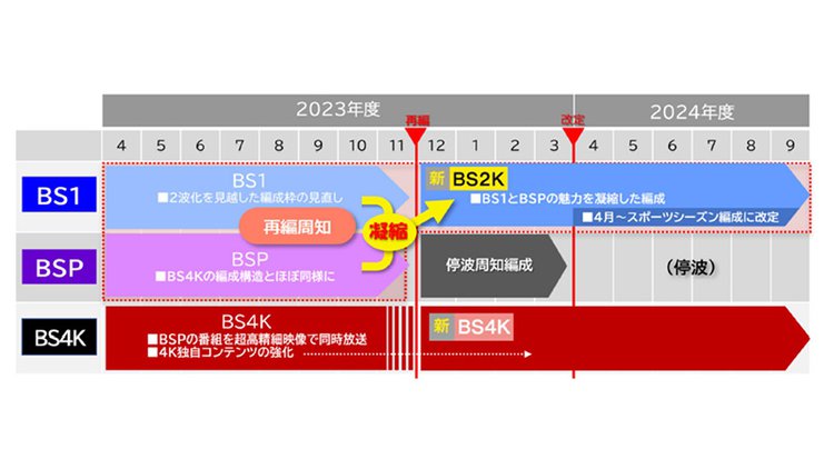 NHKの衛星放送は2023年12月に「新BS2K」と「新BS4K」の2波に再編されることが決定している。4月の改定では、これを見据えて「視聴者のみなさまに円滑に再編をむかえていただき、より魅力的になったBSを楽しんでいただくための改定を実施する」とのこと。BS1では、視聴者が現在視聴している番組を再編後も見られるようにするために編成枠を見直すという。
