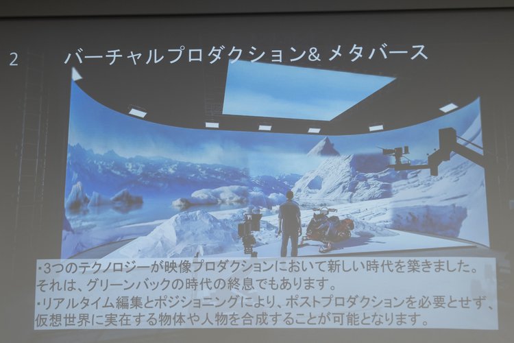 2つ目が「バーチャルプロダクション&メタバース」。これまで映画などの撮影ではグリーンバックを使っていたところ、昨今はLEDパネルに映像を流し、その前にセットを組む手法が登場していたりと、プロダクションの現場でもさまざまな変化が起こっているという。また、リアルタイム編集とポジショニングによって、ポストプロダクションなしでリアルと仮想を合成することも可能とのこと。