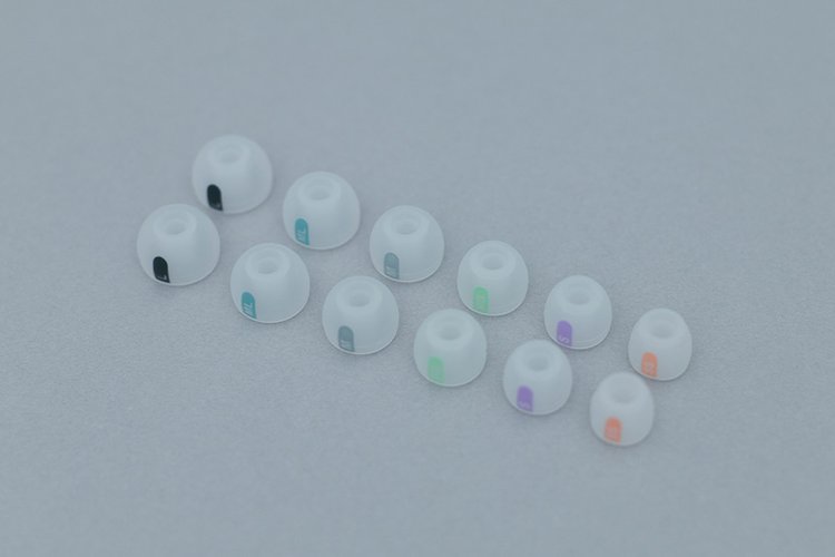 音響と装着性を最大限に引き出すべく、イヤーピースも新しくオリジナルで開発。SS/S/MS/M/ML/Lと全6サイズを用意し、サイズの印字だけでなく色の帯でもサイズ識別が可能なようにしている。