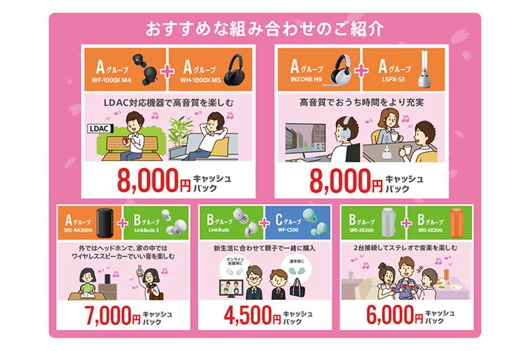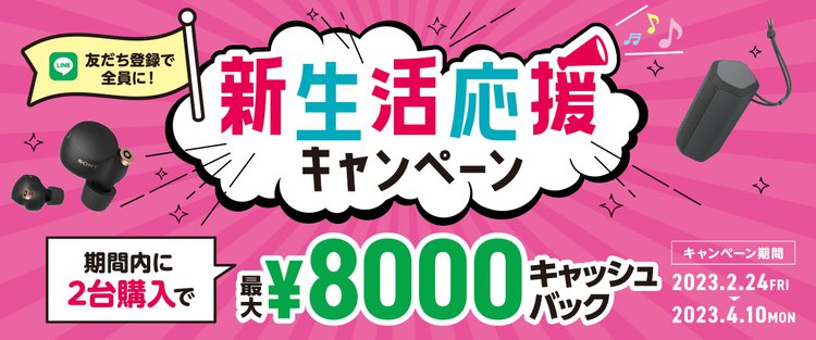 ソニーは、対象のヘッドホン・イヤホンやゲーミングヘッドセット、ワイヤレススピーカーをセット購入すると最大8,000円をキャッシュバックする「新生活応援キャンペーン2023春」を本日2月24日より開始した。キャンペーン期間は4月10日まで。