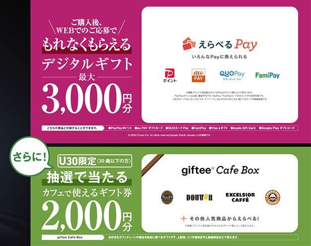 またデジタルギフトは、PayPayポイント、au PAY ギフトカード、QUOカードPay、ファミペイ、Visa eギフト、Apple Gift Card、Google Play ギフトコードから選ぶことが可能。さらに30歳以下(U30)の購入者には抽選で、タリーズコーヒーやドトールなどのカフェで使える2,000円分のギフト券がプレゼントされる。