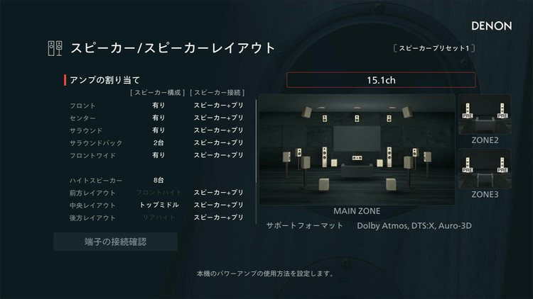 2つ目のアップデート内容として、サラウンドハイトスピーカーを使用したドルビーアトモス再生、ならびにトップスピーカーを使用したAuro-3D再生への対応が行われる。これにより、ドルビーアトモス推奨のスピーカーレイアウトでAuro-3Dフォーマットを再生したり、Auro-3D推奨スピーカーレイアウトでドルビーアトモス作品を楽しむことが可能となった。