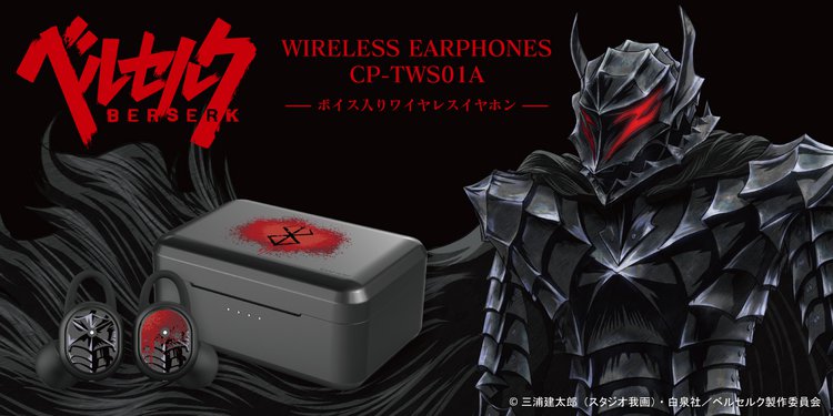 オンキヨーは、完全ワイヤレス「CP-TWS01A」とアニメ『ベルセルク』のコラボモデルの予約販売を、3月17日より開始する。価格は18,000円(税、送料込)。