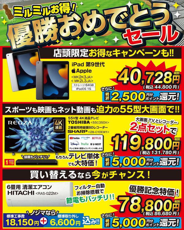 セールは店頭で行われるもので、現在公式Twitterアカウントにてセール第一弾の “超特価商品” がアナウンスされている。セールでは「iPad 第9世代」(64GB)が税込44,800円(税込)になるとともに、2,500円分のポイントを還元。