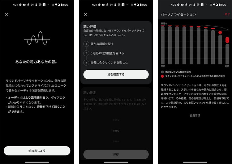 最初に生まれ年を選択し、その後、ノイズの中でビープ音が鳴っている間は画面をタッチし続けるというテスト方式。いわゆる健康診断の聴力テストのようなイメージだ。左右それぞれでテストすると、パーソナライズされたサウンドプロファイルが作成される。