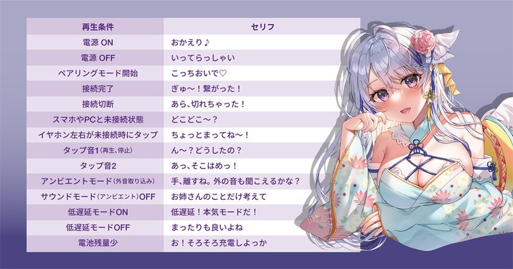 サウンドはASMRチューニングが施され、「ASMRをよりダイレクトに、より鮮明にお届けできるようこだわり抜いた一本」だと説明。また、ガイダンス音声を録り下ろしで収録しており、電源オン時に「おかえり♪」、電池残量が少なくなると「お!そろそろ充電しよっか」などの音声で案内する。
