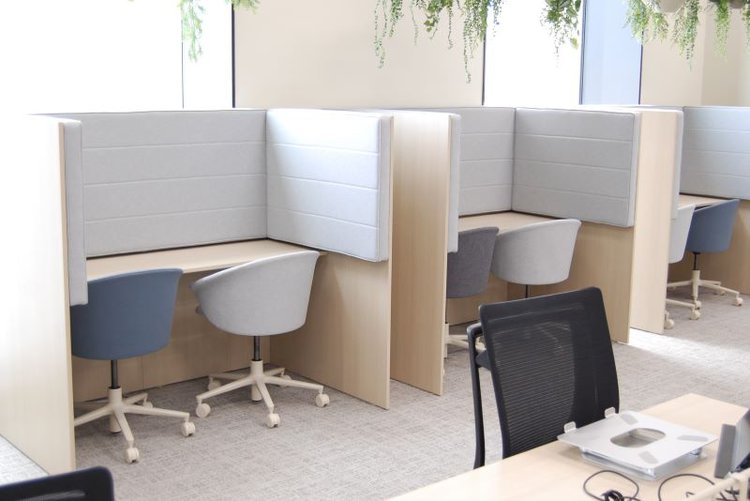 オンライン会議に対応した「テレキューブ」、会議などに最適な「フォーカスルーム」などミーティングも多様な用途に対応したスペースを用意。吸音性のパネルを使用した個人で集中できるスペースも窓際を中心に数多く設けられている。
