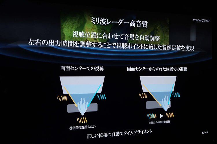 「ミリ波レーダー高音質」では、テレビから出力される音を左右で調整することで、視聴位置に合わせて音像定位を最適化する。そのため、テレビ画面の中央で視聴しても、画面中央からずれた位置で視聴しても、タイムアライメントによって位相のずれを調整し、正しい位相を生成できるという。視聴者が複数人いる場合は、テレビに最も近いユーザーを基準に自動調整される。内蔵スピーカーのみ対応となる。