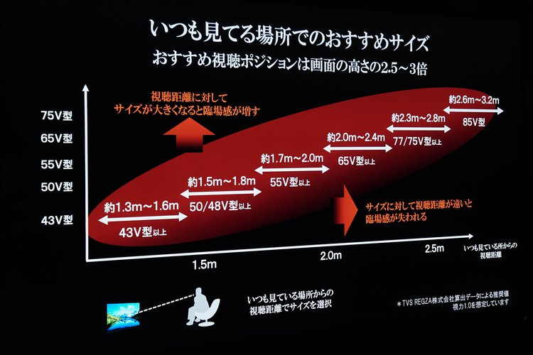 TVS REGZAの開発陣も、地デジなどの放送番組やネット動画を観ながら画質のチューニングを行う際、2.5〜3倍の距離で実施することが多く、またミリ波レーダーで最適化するときも、1.5倍は近距離、2.5〜3倍はオススメ距離、6倍までが遠距離としてチューニングを行っているとのこと。