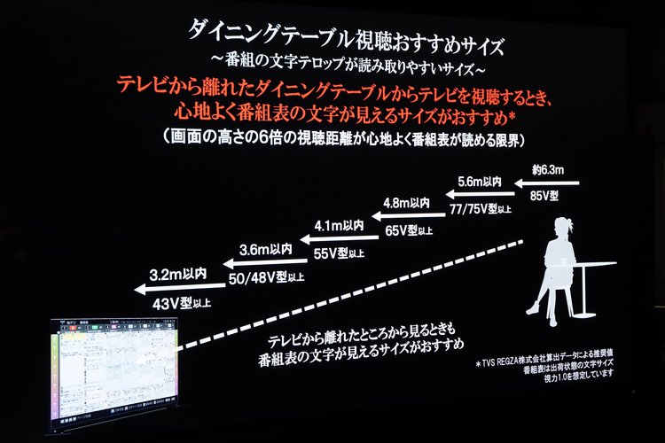 もうひとつの距離が「ダイニングテーブルからの位置」であり、いつも食事をしながら見るような位置だという。この位置について同社が着目したのが、EPG(電子番組表)が読める距離、また放送番組などの文字テロップの読み取りやすさ。こちらも視力1.0の人を考慮して統計を見出したようだ。