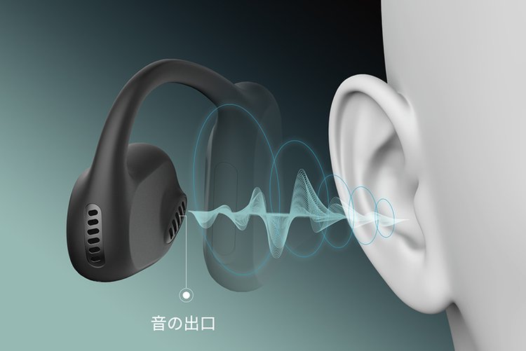 ドライバーユニットを耳元へ浮くように配置した、耳穴を塞がないオープンイヤー型のワイヤレスイヤホン。耳掛け構造によって運動してもズレにくく、周囲の音を排除しないために屋外でも安全に使用できる。左右ユニットをつなぐワイヤーが後頭部に回り込むネックバンド仕様にすることで、首周りの煩わしさを軽減し、長時間装着しても疲れにくいという。