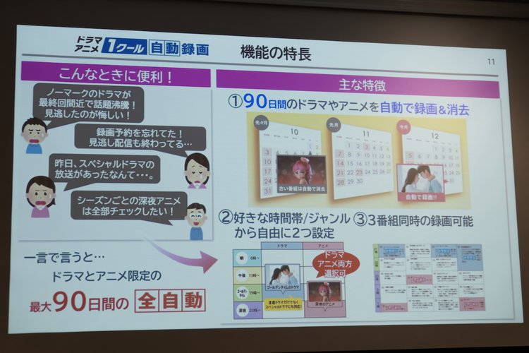 特徴である「ドラマ・アニメ1クール自動録画」は、選択した時間帯・ジャンルのドラマやアニメ作品を1クール分(約90日分)自動で録画してくれる機能。最終回を迎えてからまとめて視聴したい、ノーマークで録画予約していなかった作品・配信サービスにない作品を後から追いかけたい時などに便利だとしている。