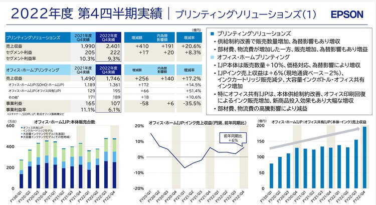 2022年度通期、プリンティングソリューションズは、オフィス・ホームプリンティングで大容量インクタンクモデルの販売が伸長。インクジェットプリンター本体の販売台数は過去最高の1700万台となり、高値販売が継続して売り上げ収益は増収に。しかし部材費・物流費高騰、ドル高影響により事業利益は減益となった。