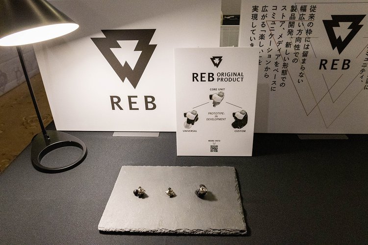 また、イヤホンの基幹部分をユニット化し、ユニバーサルシェルとカスタムIEMを交換できるオリジナルプロダクトも開発中。プロトタイプの段階の製品が展示されていたが、しっかりした金属ボディの筐体で、表面に三角形のREBロゴが刻まれるなど、今後どう製品化されていくか期待が高まる。