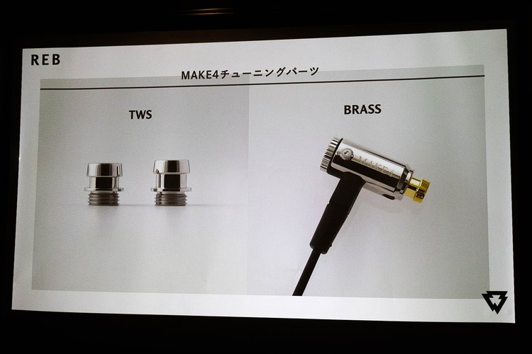 REBで展開される独自プロダクトとしては、まずfinalのDIYイヤホンキット「MAKE4」のチューニングパーツを用意。第一弾製品は音導管が少し短い「TWS」、真鍮製の「BRASS」、中央が少しくびれた「ORIFICE」の3種類で、それぞれヘッドフォン祭の会場で試聴機が用意された。
