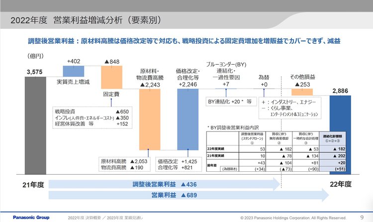 営業利益の増減要素は、実質売り上げ増減が402億円のプラス、くらし事業やエナジーでの成長に向けた投資などにより固定費848億円のマイナス。原材料・物流高騰で2243億円のマイナス、価格改定や合理化などによる効果が2246億円のプラスとなった。