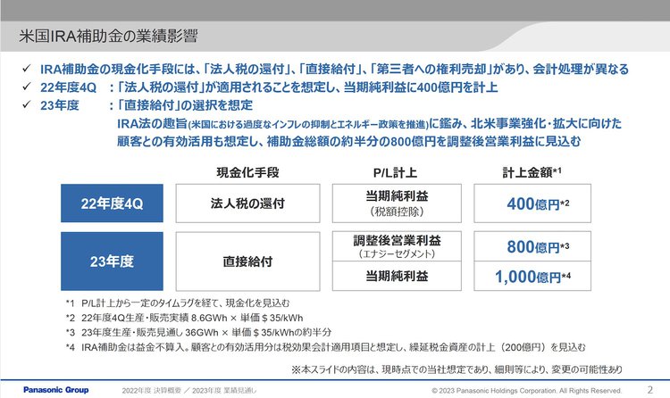冒頭で、米国IRA補助金の業績影響について説明。「IRA法は、米国における過度なインフレ抑制とエネルギー政策の推進を主旨とし、得られる補助金は米国での車載電池事業の投資に活用、北米事業の強化・拡大に向けた顧客との有効活用も考えている」とした。2022年度4Qでは法人税の還付が適用されると想定、当期純利益に400億円を計上。2023年度は政府からの直接給付を選択すると想定、補助金総額の半分である800億円をエナジーセグメントの調整後営業利益に見込み、顧客との有効活用見合いによる当期純利益の影響額は1000億円とした。