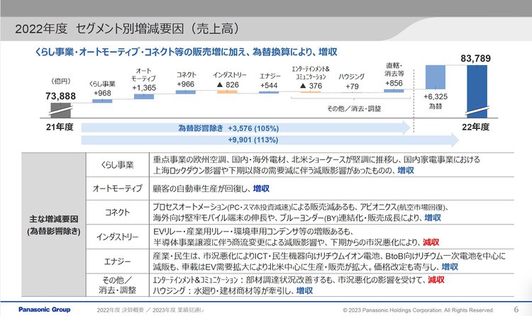経営環境変化の見通しとして、「くらし事業、オートモーティブ、コネクト、エナジーはおおむね市況の改善を前提として増収、増益の見込み。インダストリーは減収、減益の見通しで、特にICT端末の需要が前年を下回るが、下期からは回復基調に転じると見ている。2年間影響を受けた原材料価格の高騰や半導体不足によるマイナス影響は、おおむね解消する見込み」とした。