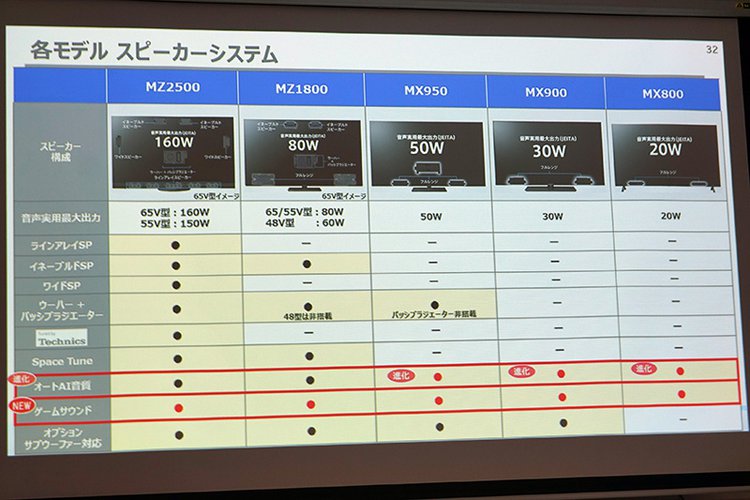 AI技術でシーンを判別して最適な音質に調整する「オートAI音質」を進化させるなど、音質面も強化。ゲーム向けの新たな2つの音声モードを追加するなどもしている。また、イネーブルドスピーカーなどは搭載しないもののDolby Atmosにも対応する。