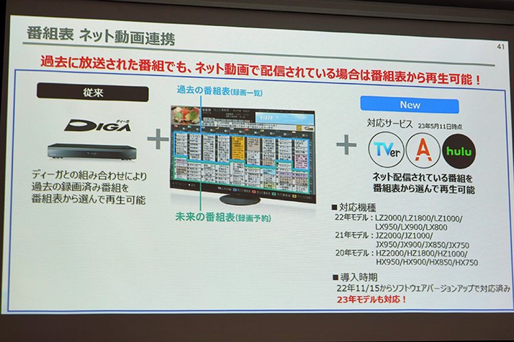 また、番組表のネット動画連携機能も備えており、TVer、TELASA、huluで配信がある番組は、EPGから選択して再生可能。さらに、同社製レコーダー “ディーガ” 対応モデルと組み合わせると、過去番組も番組表に表示して、見逃し配信を直接再生できるようになる。同機能は2022年秋に2020年以降の4Kモデルを中心にアップデート対応している機能で、本機も発売時から対応する。対応配信サービスは順次拡大予定だという。