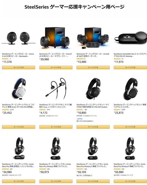 ヘッドセットのジャンルで最大の割引率となるのは、2021年発売の「Arctis Prime」で23%オフにて販売。スピーカーはセール対象となる「Arena 3」「Arena 7」「Arena 9」の全3製品が一律で5%の割引が行われる。