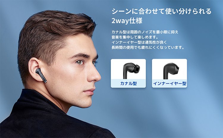 カナル型からインナーイヤー型へ付け替えが可能な“1台2役”の完全ワイヤレスイヤホン。イヤーピースを装着した状態ではカナル型、取り外した状態ではインナーイヤー型として使用でき、用途に応じて本機1台で使い分けられる。