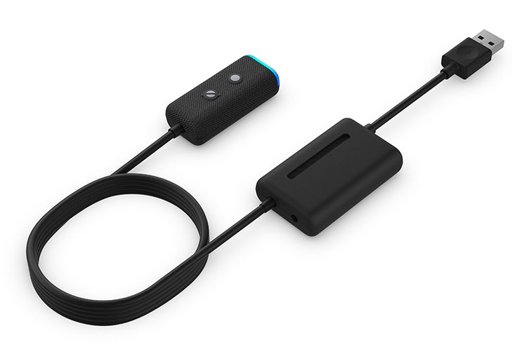 車内に設置することで「Alexa」とハンズフリーで対話ができる車載デバイスの第2世代モデル。車内の音響特性を考慮して設計された5つのマイクによるマイクアレイで、カーオーディオからの音楽、エアコンの音、ロードノイズなどが鳴る車内でもユーザーの声を正確に聞き取ることができる。