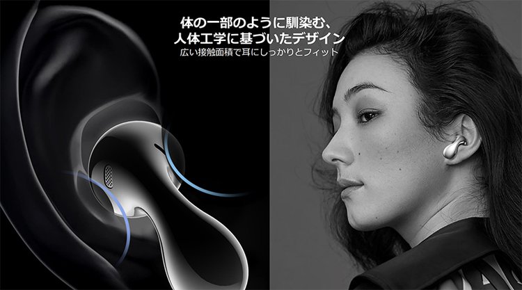 イヤホン本体は、自然の美しさから着想を得たとする、アイコニックな曲線デザインを実現。滑らかな曲線のみで構成された外観に加えて、1万人以上の耳サンプルからシュミレーションを実施し、それを元に設計した人体工学に基づく形状を採用している。