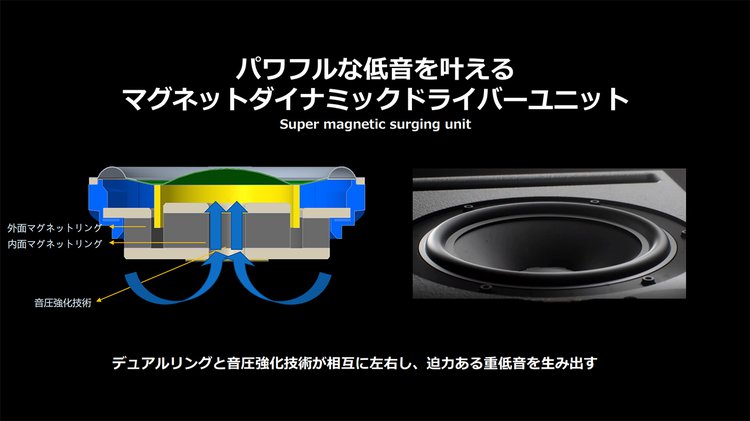 ドライバーには、磁気密度を飛躍的に向上させる「デュアルマグネットリング機構」と、気流の通り道を広げて空気抵抗を減らし、ドライバーユニットの振幅をより大きくする「音圧強化技術」を採用した、11mm径のマグネットダイナミック型ドライバーを搭載する。