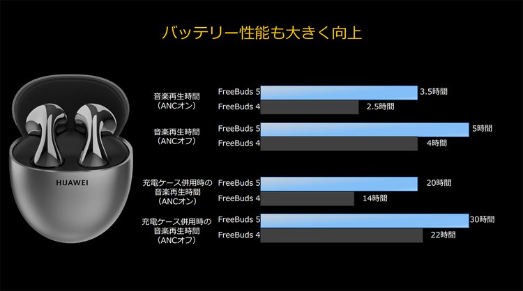 バッテリー性能も前モデルから大幅に向上。連続再生時間(ANCオフ時)は、FreeBuds 4がイヤホン単体で4時間、ケースとの併用で22時間であったのに対し、FreeBuds 5はイヤホン単体で最大5時間、ケース併用で30時間を実現した。ほかANCオン時はイヤホン単体で3.5時間、ケース併用で20時間、新たに5分間の充電で2時間再生が可能な「超急速充電」にも対応する。