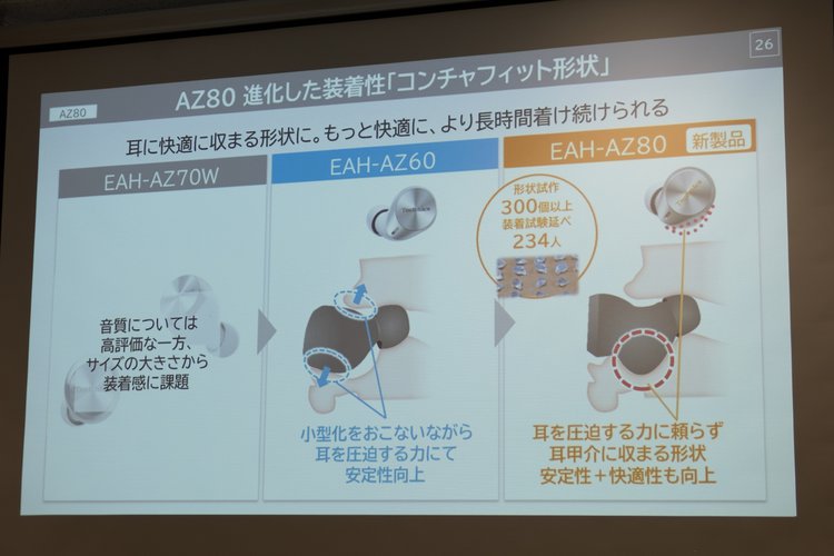 都内で行われた製品発表会では、EAH-AZ80の開発エンジニアによるトークセッションも実施。音質と装着性を両立することの苦労が語られた。