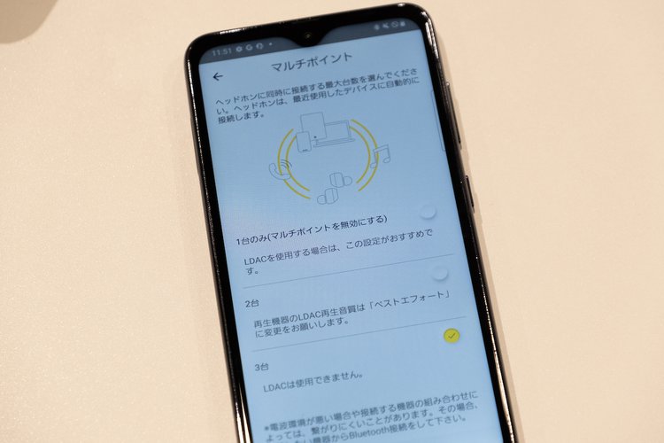 さらに “業界初” となる3台マルチポイント接続に対応。市場からも要望する声は多くあったとのことで、「一見すると必要ないように思えるかもしれないが、たとえば私用スマホとPC、会社用スマホに一気に接続できたりと、使ってみると手放せなくなる」と語っていた。